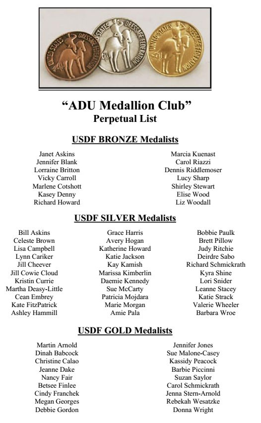 As recognition for these prestigious achievements, ADU Members who have earned their USDF Bronze, Silver, and Gold Medals during the current year will receive an ADU Medallion Club special recognition award to commemorate their achievement.